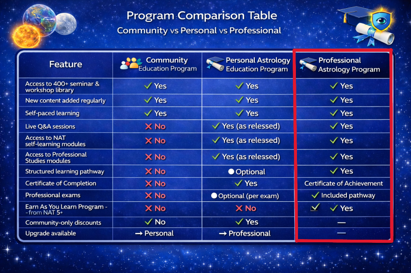 This program represents the culmination of decades of astrological teaching excellence — designed for the modern student, grounded in tradition, and focused on supporting your journey from student to professional astrologer.